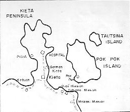Kieta, nestling against the calm waters of the bay that bears its name, has always played an important part in the story of Bougainville. From 1900, when Marist missionaries bought the first land, to 1970, when it became the boom port of entry to the Project, something has always been going on in Kieta. The first Europeans to land at the Kieta Peninsula came to take things away. Whalers and beche-de-mer ships hunted the produce of the nearby ocean, while blackbirding vessels came to trade in human lives to work the Queensland plantations or those of German Samoa and of Fiji. In the late 19th Century the North Solomons came under the German "sphere of influence". Marist missionaries fanned out from Samoa into Melanesia, but they did not arrive at Bougainville until 1900 when they landed at Kieta. A sale of land was immediately arranged with a Pok Pok chief called Serai. Some 35 hectares were bought near Rigu for 10 axes, 10 work knives, 20 length of cloth, a box of beads and a six-oared whaleboat. The sale was not made without some resentment from the Rigu people, and a year later two schoolboys were killed during the ensuing land dispute. The missionaries left the island but returned again in 1903. The same year a Marist Mission was opened at Buin, then in 1904 at Koromira, in 1910 at Buka, during 1911 at Banoni (Torokina) and at Tinputz in 1918. The mission land at Kieta was on the hill not far from the present Tubiana Mission, and was called Makaki. Today, all that still stands is the church and graveyard, overgrown and neglected. In 1905 the German Government opened an Administrative station at Kieta under the control of August Doellinger. By 1914 a mission boat, the Kulanbangara, serviced the area and the total European population of Bougainville was 45, of whom 23 were missionaries. War meant the end of the German regime and the hoisting of the Australian flag, although it was not until 1920 that military administration gave way to civil. A sub-district office was set up at Kieta, the district office being at Sohano in Buka Passage. For the next 20 years Kieta grew little by little. The township moved from the old German site, where the sub-district office is now, and slowly took root within the limited land space of the present location. Expropriation Board plantation managers and the mission came to town occasionally to shop at the new Chinese trade stores, and the occasional trading schooner moored in the harbour.