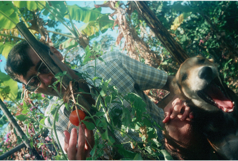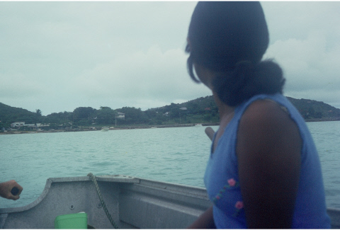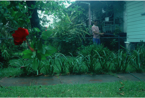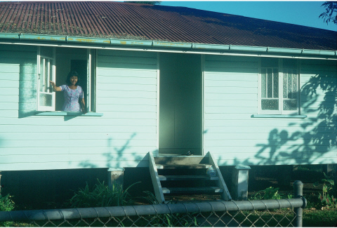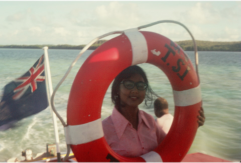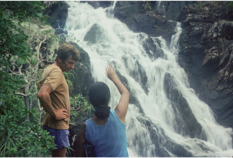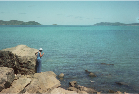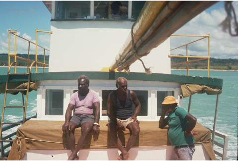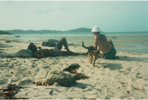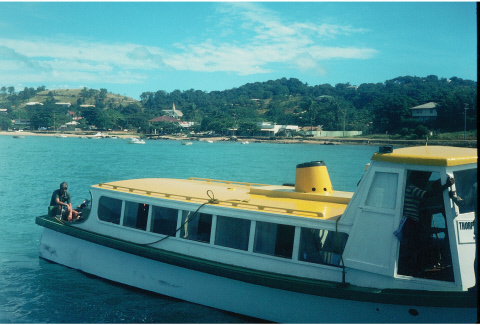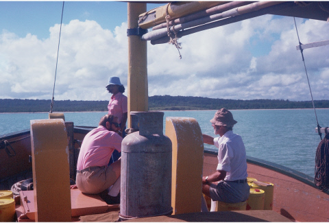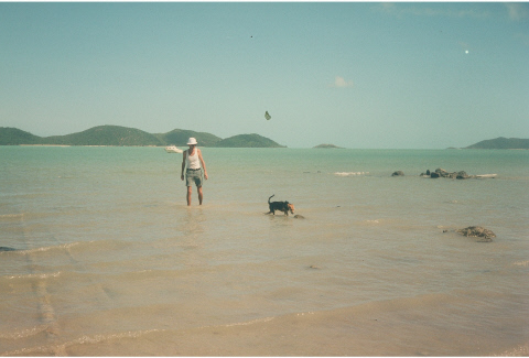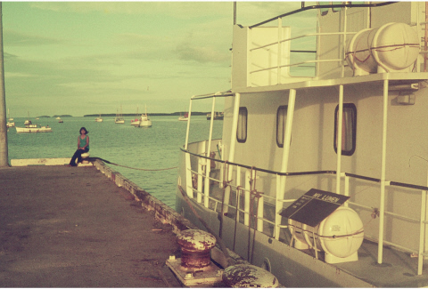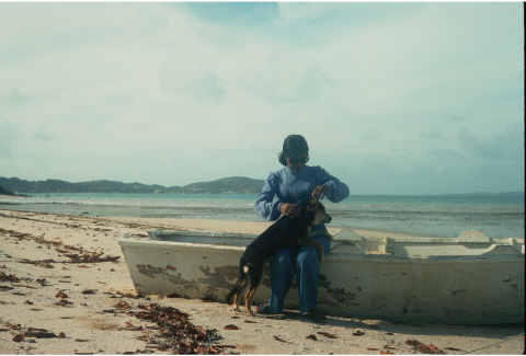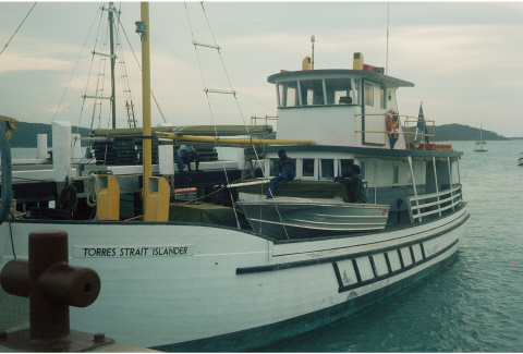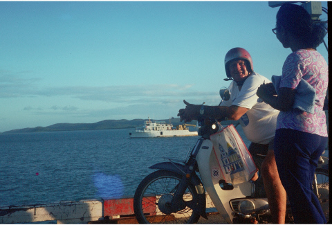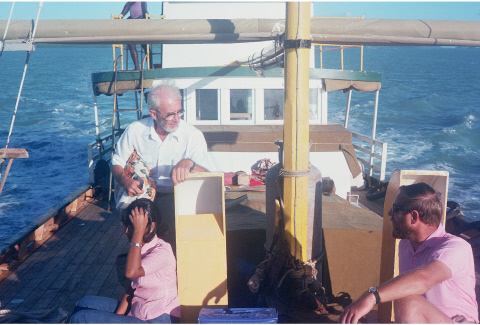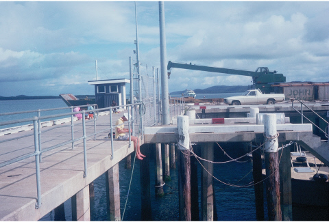 Our neighbour "Bluey" Douglas and Shirley on the jetty; his ship MV Melbidir, in background